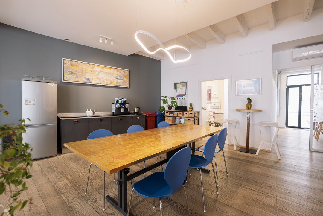 Sich ständig ändernde Teams und wachsendes Geschäft? Unsere Arbeitsbereiche können mit deinem Unternehmen mitwachsen. Der helle und luftige multifunktionale Team Room Maxi mit Zugang zur Terrasse kann auch problemlos größere Teams mit bis zu 14 Personen hosten. Er besitzt eine flexible Einrichtung, Designermöbel, Zugang zur Gemeinschaftsküche und sogar eine Dusche. Darüber hinaus ist er selbstverständlich mit starken WLAN und einem Beamer ausgestattet. Zu unseren Arbeits- und Gemeinschaftsbereichen hast du 24/7 Zugang.